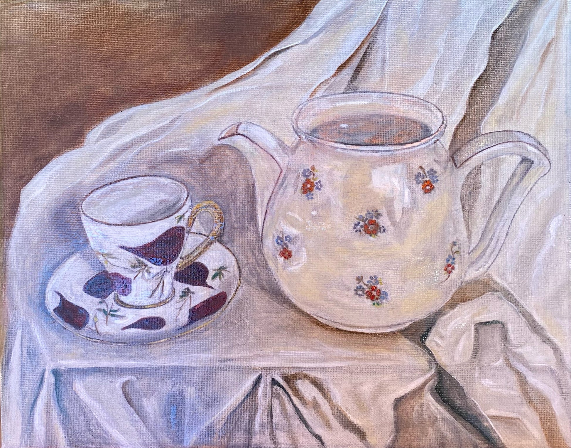 This elegant still-life painting features a delicate porcelain teapot and matching teacup resting on softly draped fabric. The scene is bathed in gentle light, highlighting the refined floral patterns and subtle reflections on the ceramic surfaces. Soft, muted tones and careful brushwork create a serene and timeless atmosphere, celebrating the quiet beauty of everyday objects.